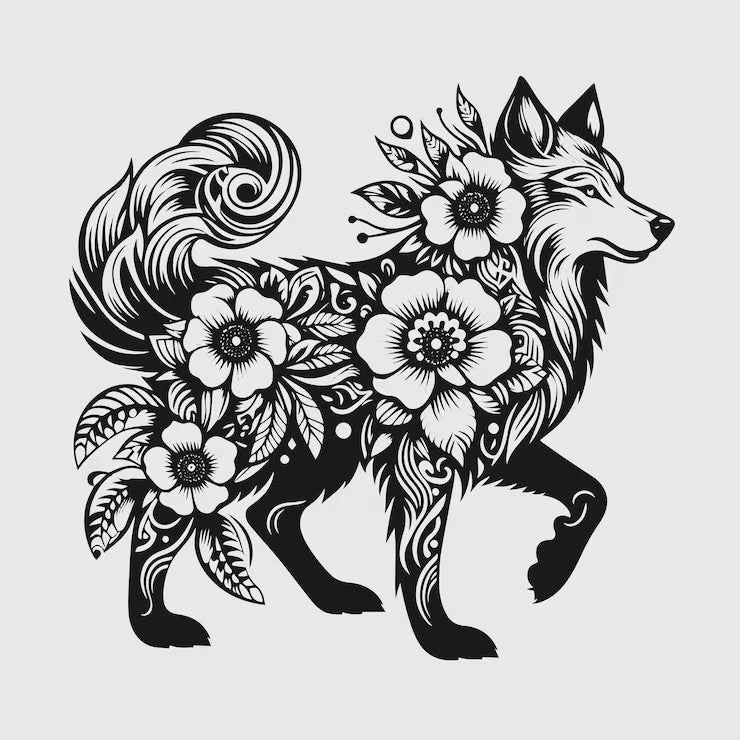 Lobo estilizado com flores e folhas ornamentais, estilo tatuagem.